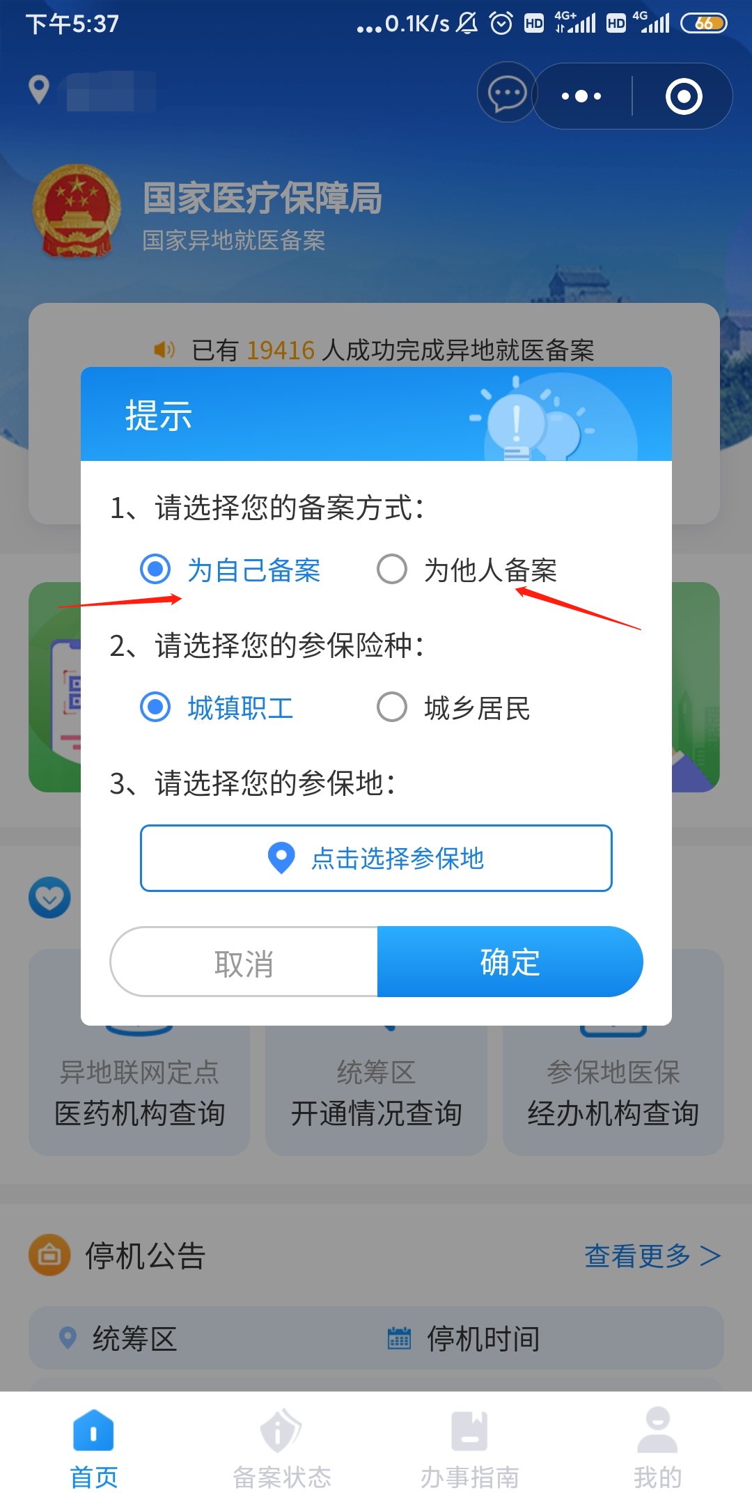 3、备案页面,可选择为自己备案,也可为他人备案(父母或亲戚朋友),根据自己的实际情况选择备案人、参保险种、参保地;