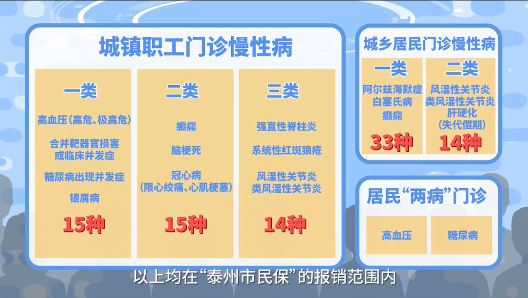 泰州的门诊慢性病涵盖了城镇职工门诊慢性病44种,主要分为:一类门诊慢性病15种,二类门诊慢性病15种和三类门诊慢性病14种;城乡居民门诊慢性病47种,主要分为:一类门诊慢性病33种和二类门诊慢性病14种;居民“两病”门诊,主要为高血压和糖尿病。