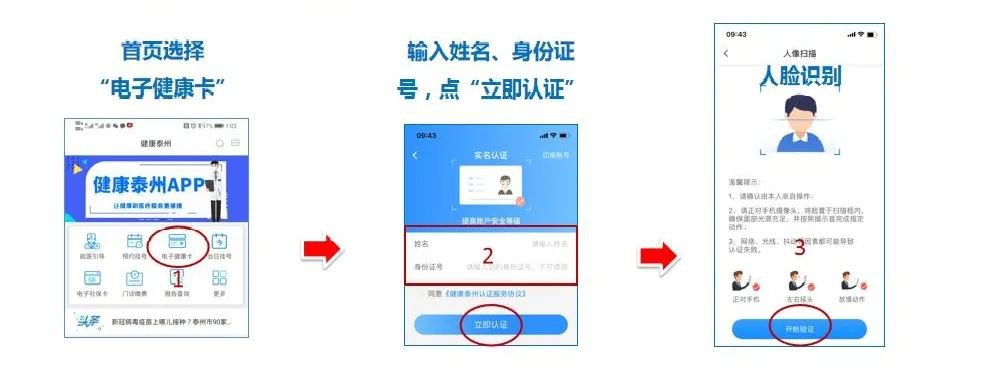 3、实名验证:注册成功后,登录,点击主页上的“电子健康卡”,输入姓名、身份证号,人脸认证成功。