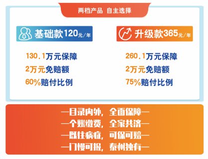 “泰州市民保”分基础款和升级款,一年120元或365元,最高保障260万元。两款产品保障范围均涵盖医保目录内住院医疗费用、医保目录外住院医疗费用和门诊慢性病医疗费用。升级款产品增设罕见病专项用药和质子重离子住院治疗费用。