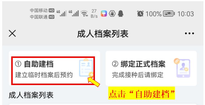 3.注册完成后返回“新冠疫苗接种”模块,再次点击,选择“自助建档”。( 对于既往已建档学生,请选择“绑定正式档案”,跳过步骤4)。