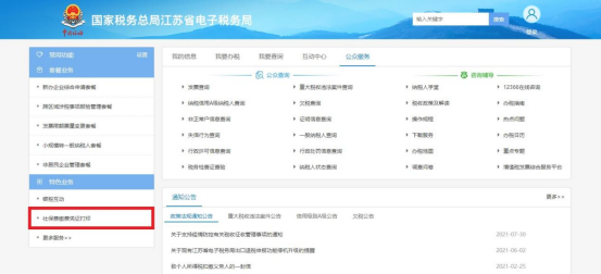 点击右下方的“公众服务”栏目,在栏目左下角特色业务中点击“社保费缴费凭证打印”(下图中标红部分)。