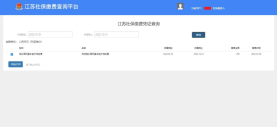 点击“提交”后,跳转“查询打印”页面,在新页面中选择“所属期起”为2022-01-01,“所属期止”为2022-12-31,点击查询,可以查询出符合条件的缴费记录。