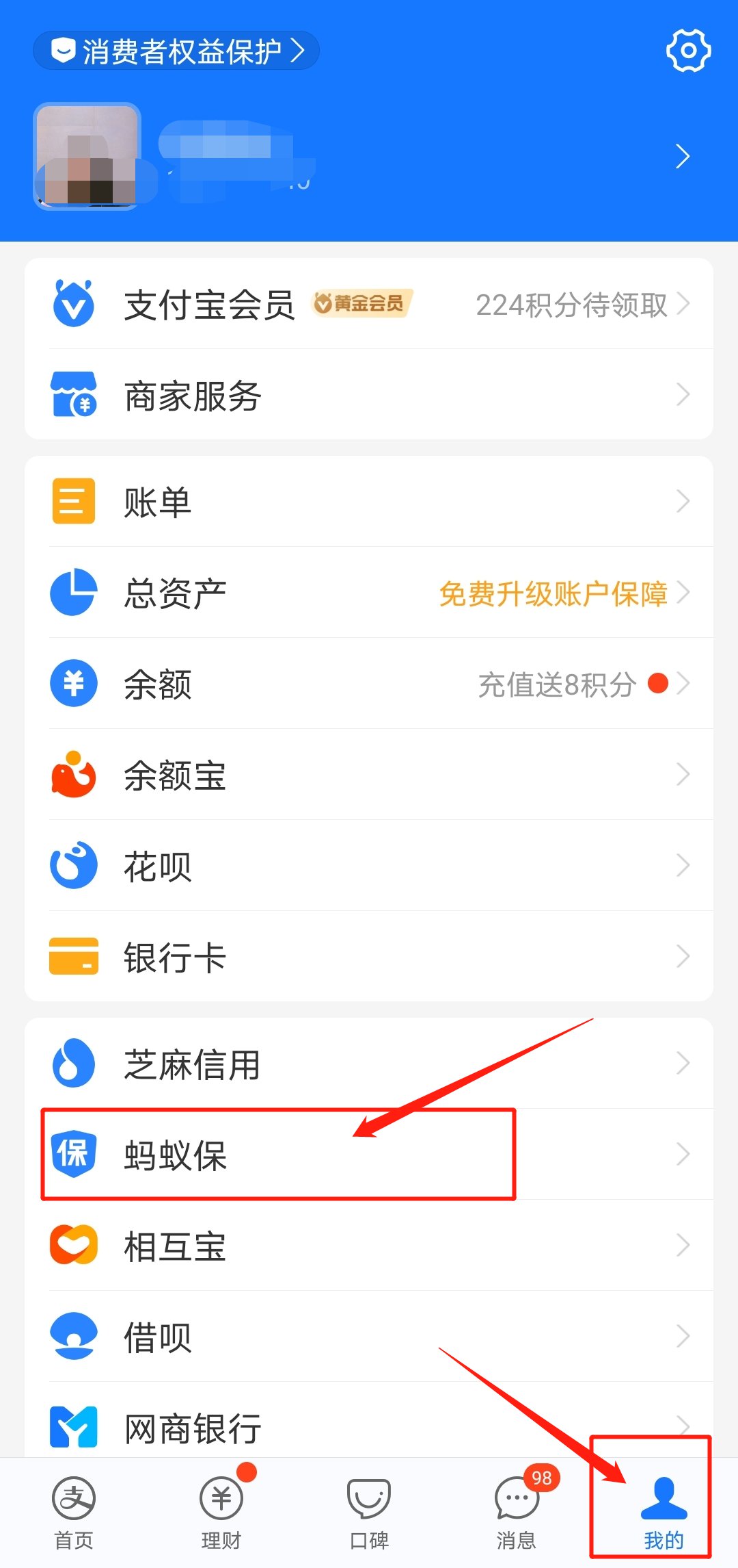 打开支付宝页面,在下方导航栏位置点击“我的”,再点击“蚂蚁保”,进入个人保险投保页面: