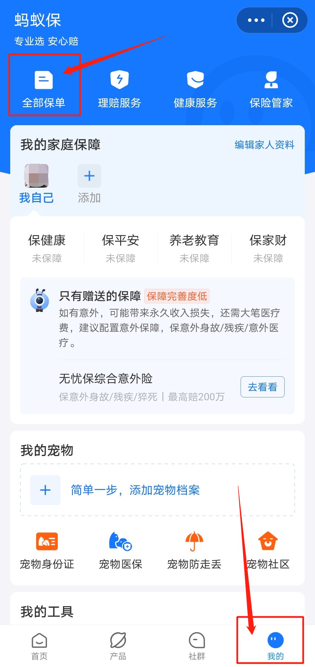 打开支付宝页面,在下方导航栏位置点击“我的”,再点击“蚂蚁保”,进入个人保险投保页面: