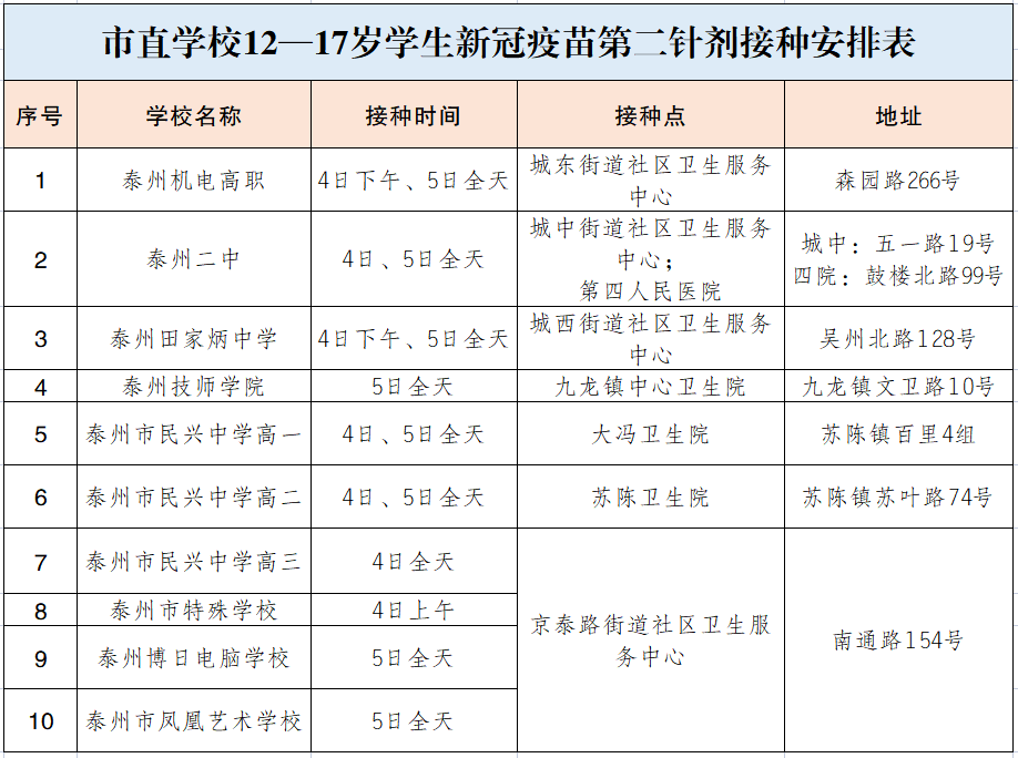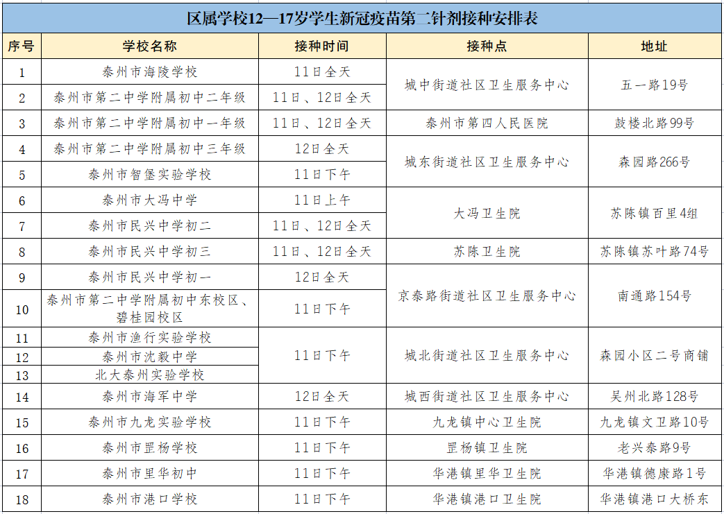 海陵区即将启动12-17岁人群新冠疫苗第二针接种,具体时间及地点安排如下: