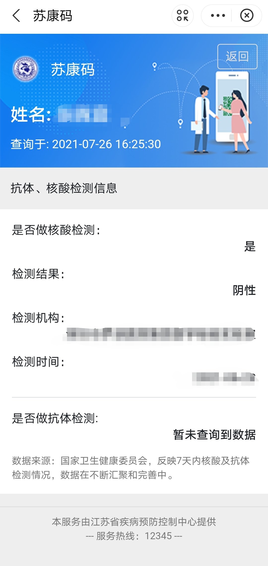 1、进入“苏康码”申领页面后,点击右下方的“核酸/抗体检测查询”: