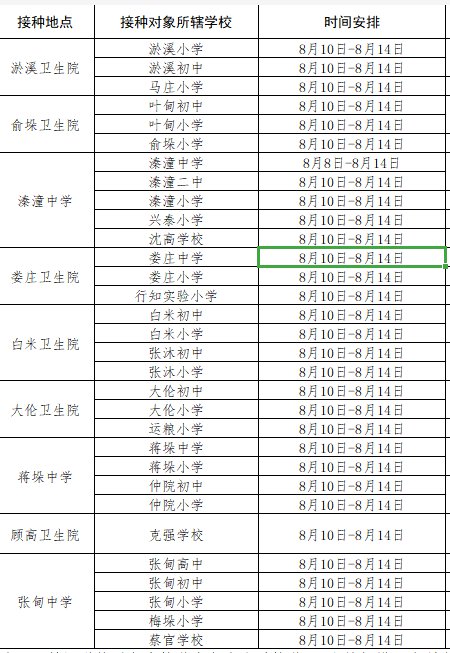2.农村学校学生,8月10日启动接种工作,由学校与辖区卫生院对接时间,有序组织学生到辖区卫生院集中接种。其中,蒋垛镇辖区内学校学生到蒋垛中学接种点接种,溱潼镇(含沈高、兴泰)辖区内学校学生到溱潼中学接种点接种,张甸镇辖区内的学生到张甸中学接种点接种。