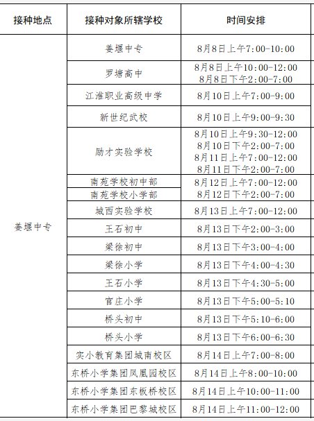 各学生具体接种时间、地点以及相关注意事项,由学校通知到位。另外,为确保符合接种条件的12—17岁学生“应种尽种”,对于城区学校现居住在农村的学生、农村学校现居住在城区或其他街道的学生,按照就近接种原则可选择到城区接种点(姜堰中专)或就近的镇街接种点接种。统一接种时间为:8月14日14:00-19:00。