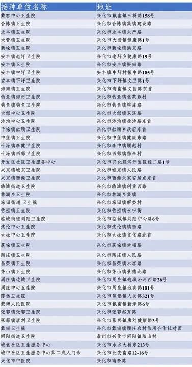 泰州市兴化市未成年新冠疫苗接种单位一览表