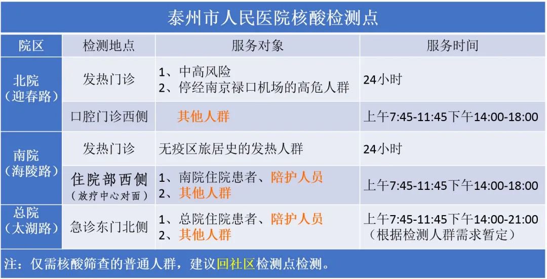 泰州市人民医院核酸检测点安排表: