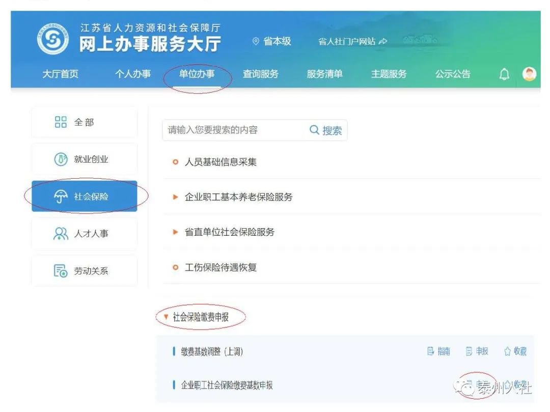选择单位办事——社会保险——社会保险缴费申报——企业职工社会保险缴费基数申报,点击“申报”按钮,进入申报页面。