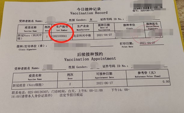 目前江苏省的疫苗生产批号没有网上查询入口,可以直接在接种单上查看,图例: