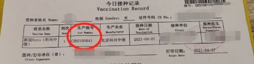 目前江苏省泰州市的新冠疫苗生产批号没有网上查询入口,可以直接在接种单上查看,图例: