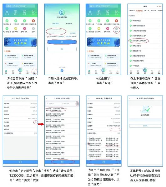 退休人员手机下载 “江苏智慧人社”APP注册登录,参照《体检手机预约流程》预约体检日期。具体预约流程如图所示: