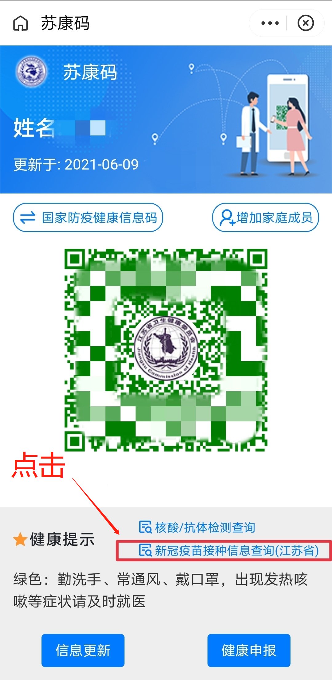 (2)支付宝查询:在输入栏搜索“健康码”,进入健康码小程序查询界面,点击“立即查看”,点击二维码下方“新冠疫苗接种信息查询(江苏省)”。