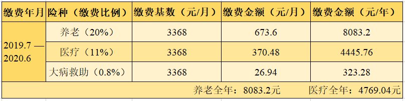 2019.7—2020.6年度最低缴费标准(缴费金额=缴费基数×缴费比例)