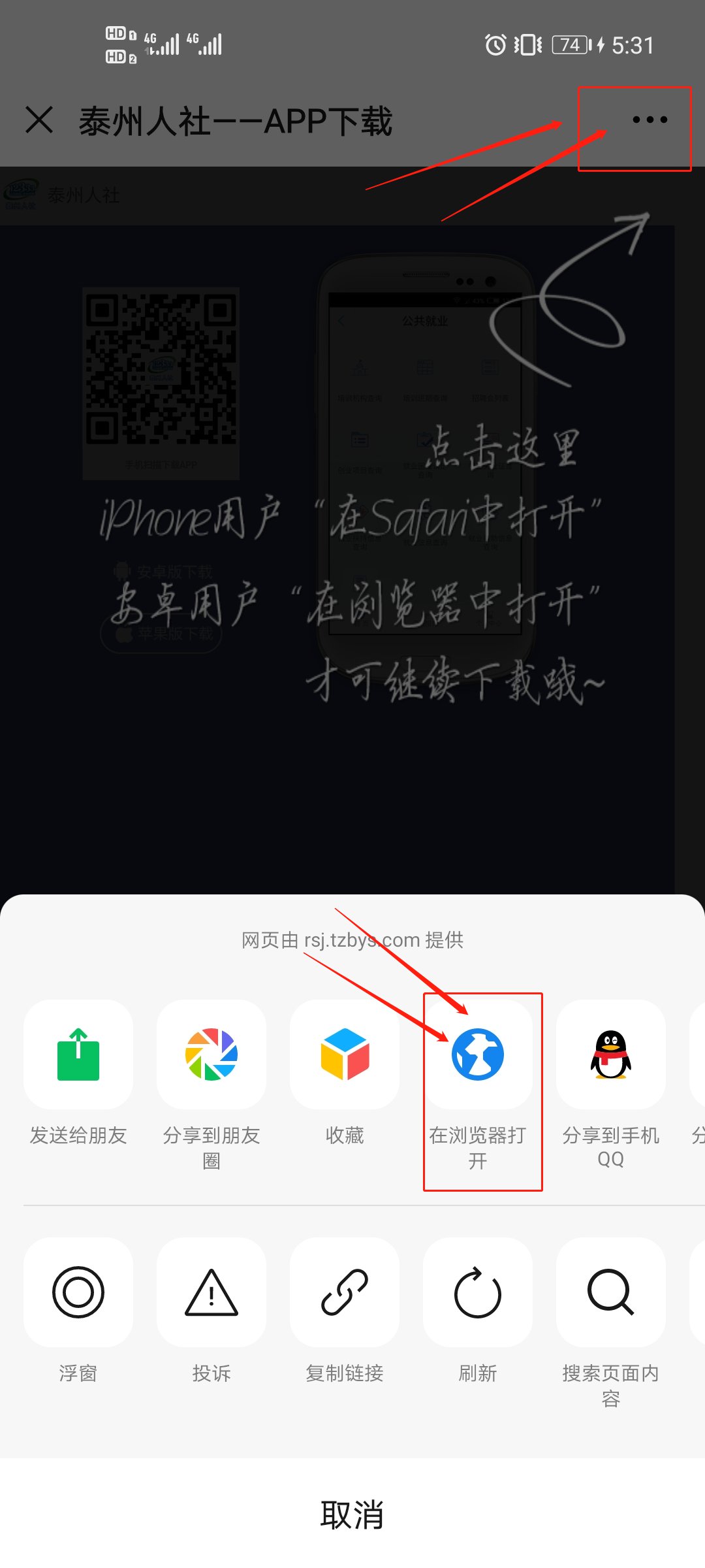 2、温馨提示:点击链接出现需要用浏览器打开的情况,点击右上角符号,点击“用浏览器打开”即可