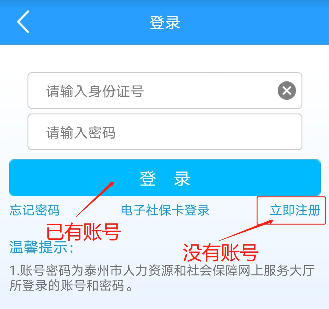 注意:登录账号为泰州市人力资源和社会保障网上服务大厅所登录的账号的密码,还未有账号的,点击立即注册。