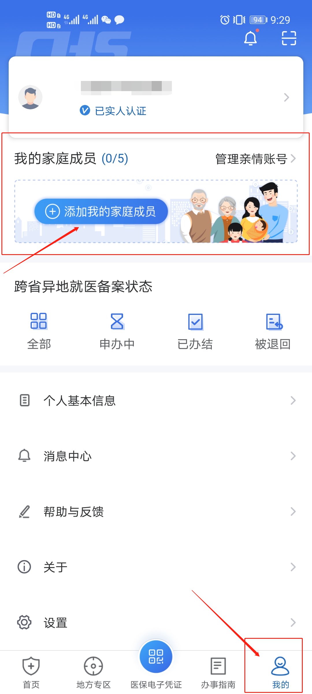 第三步:点击底部菜单栏【我的】进入个人中心页面,在【我的家庭成员】板块点击图标“+”添加亲情账户,根据提示,上传资料,完善信息。