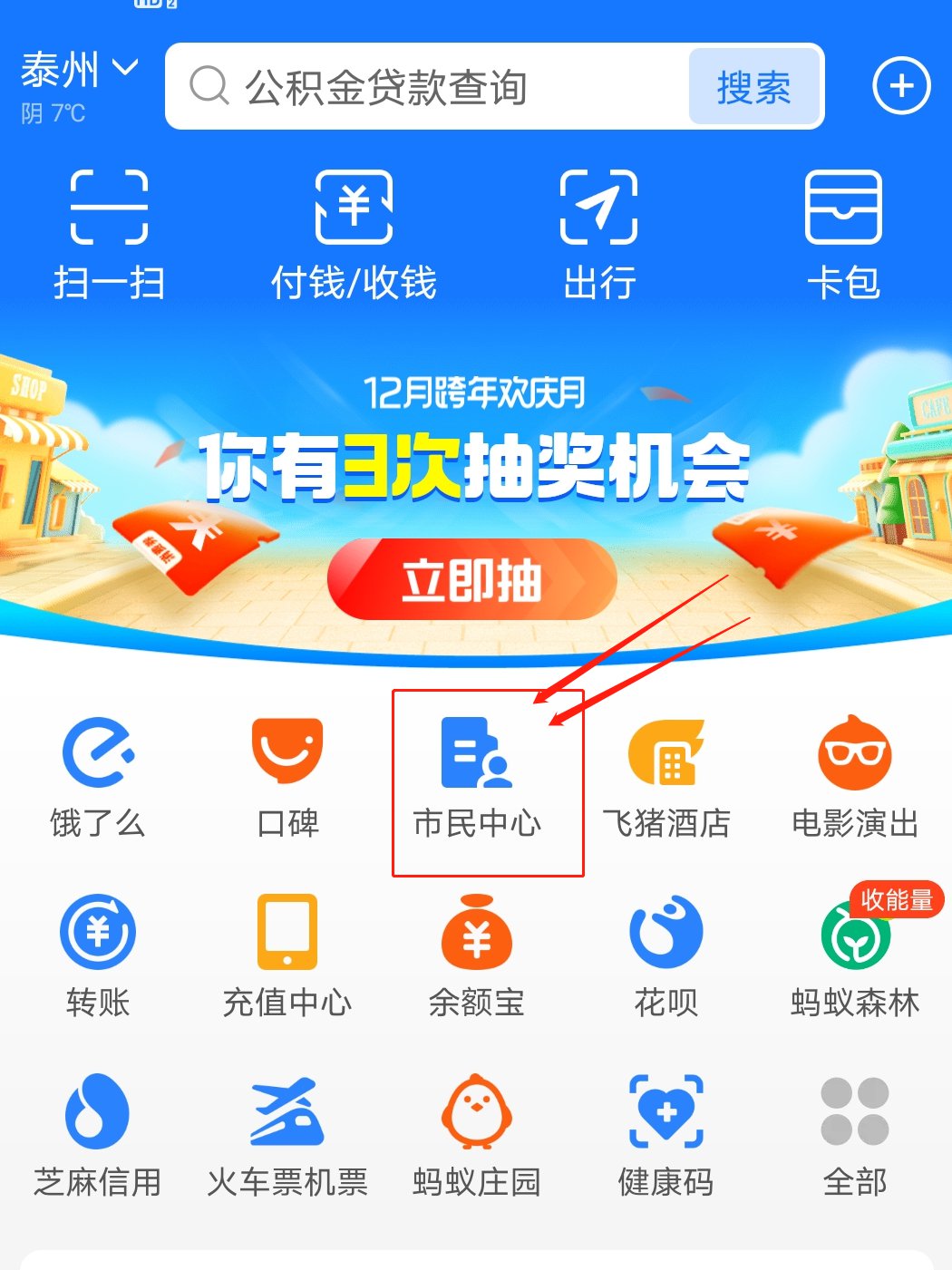 第一步:打开手机支付宝,在首页点击“市民中心”