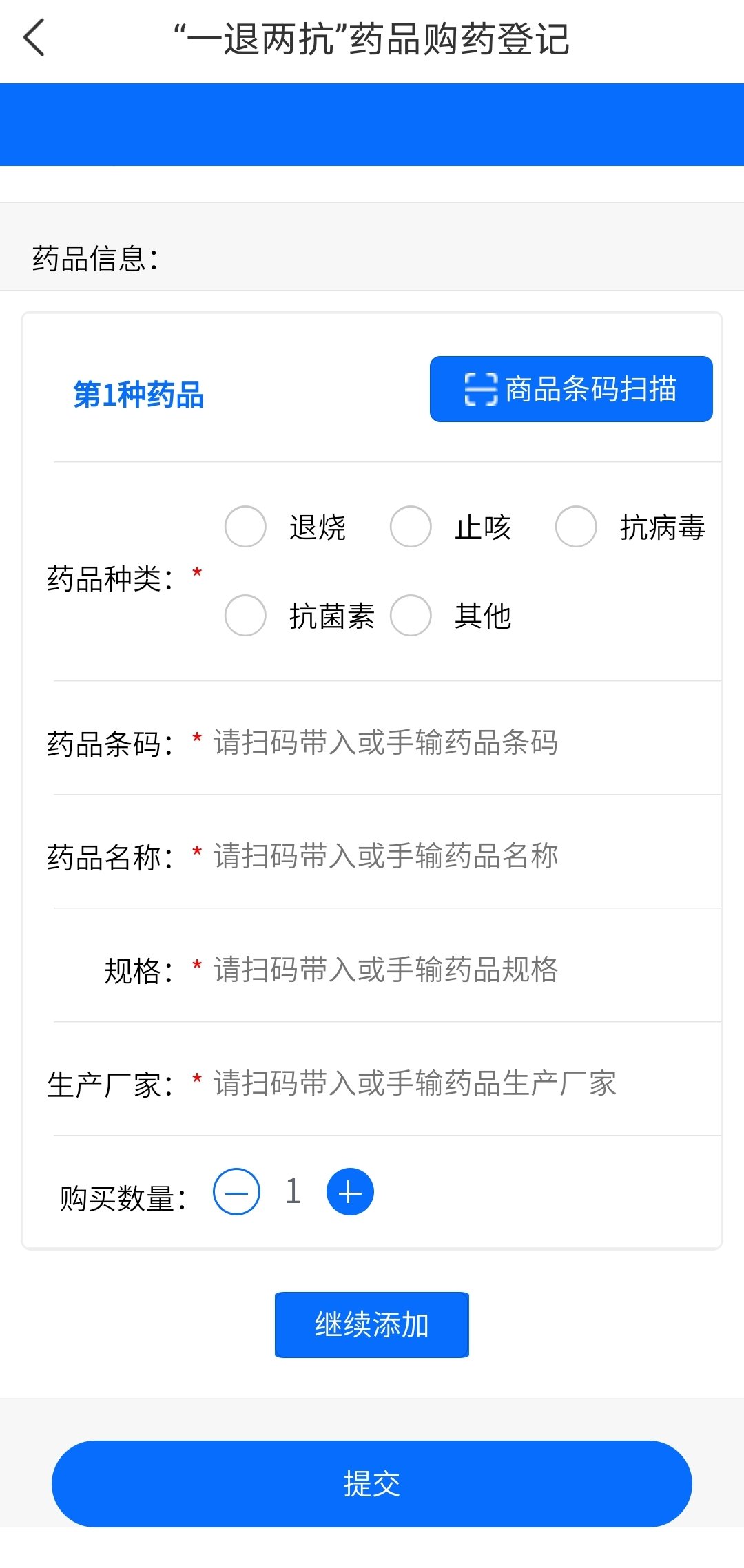 扫描之后可获取药品条码,药品名称,生产厂家,选择购药数量之后点击保存即可。购买多种药品,点击“继续添加”即可。