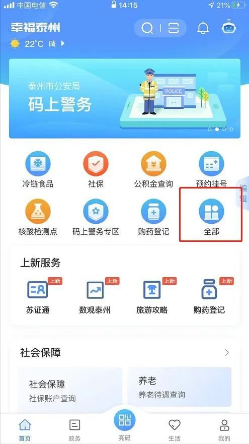 第一步:使用手机打开“泰州通”APP,进行实名注册,完成之后点击首页,如下图所示: