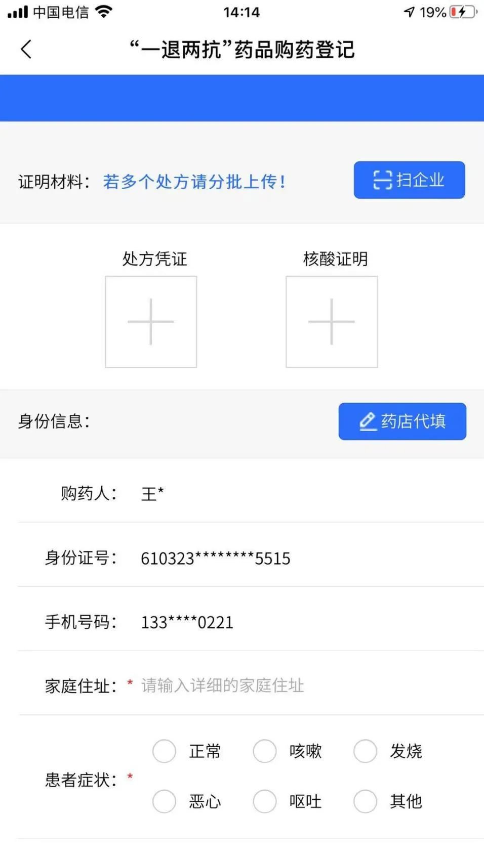 红色区域为带出的药店名称;处方凭证与核酸证明为非必须上传项目,按照购药登记页面字段进行如实填写个人信息,购药人,身份证号码,手机号码三项为app认证之后自动带入的信息不可更改。