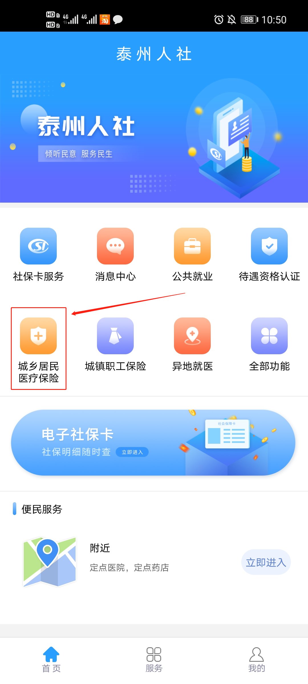 (1)下载“泰州人社”官方APP,进入首页,点击“城乡居民医疗保险”
