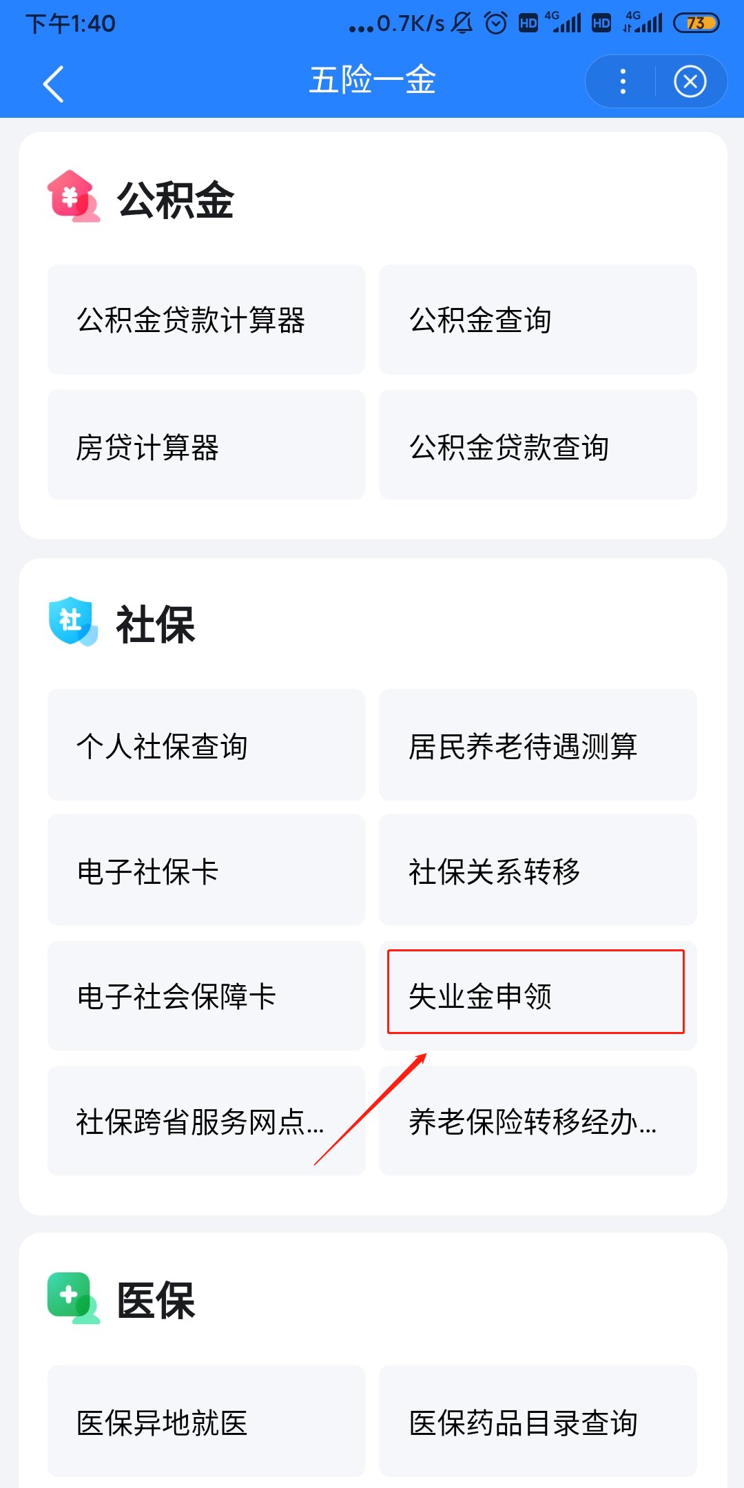 第一步:进入百度城市服务小程序,点击“五险一金”,点击“失业金申领”
