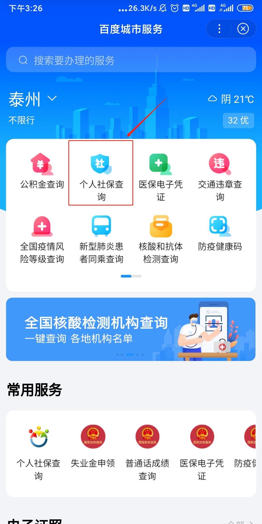 2、城市定位为“泰州”,点击“个人社保查询”