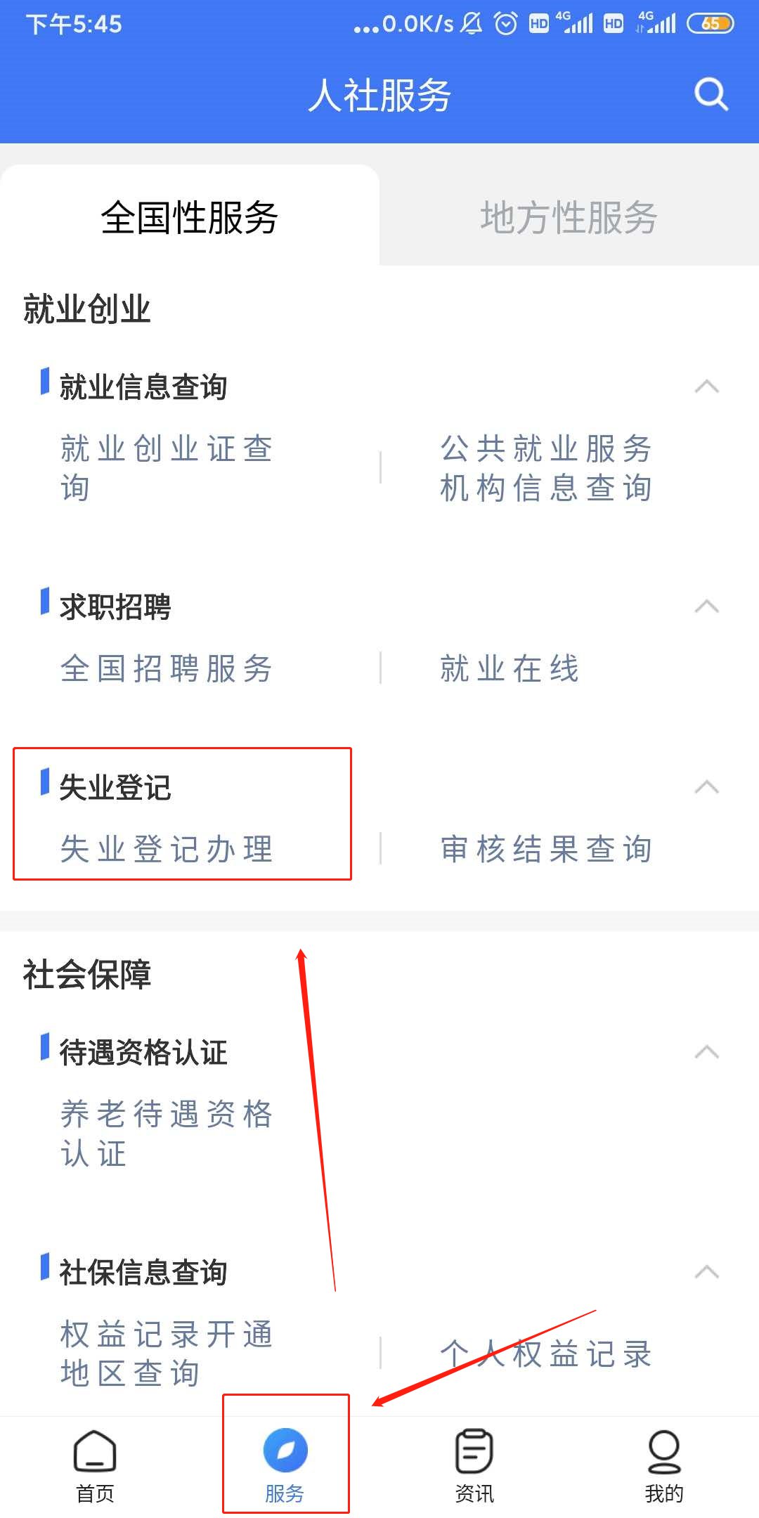 2、办理步骤:点击“服务”专栏,进入“失业登记办理”,填写个人信息登记办理即可