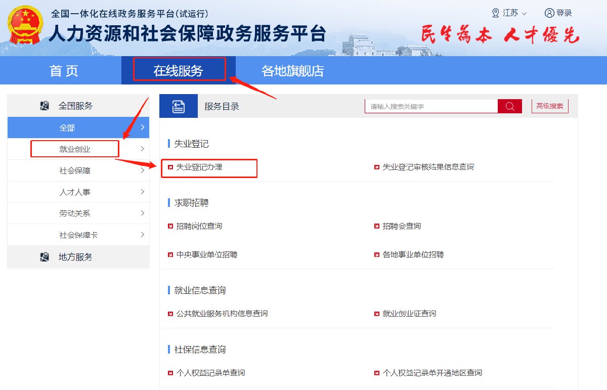 2、办理步骤:在首页点击“在线服务”——“就业创业”——“失业登记办理”即可