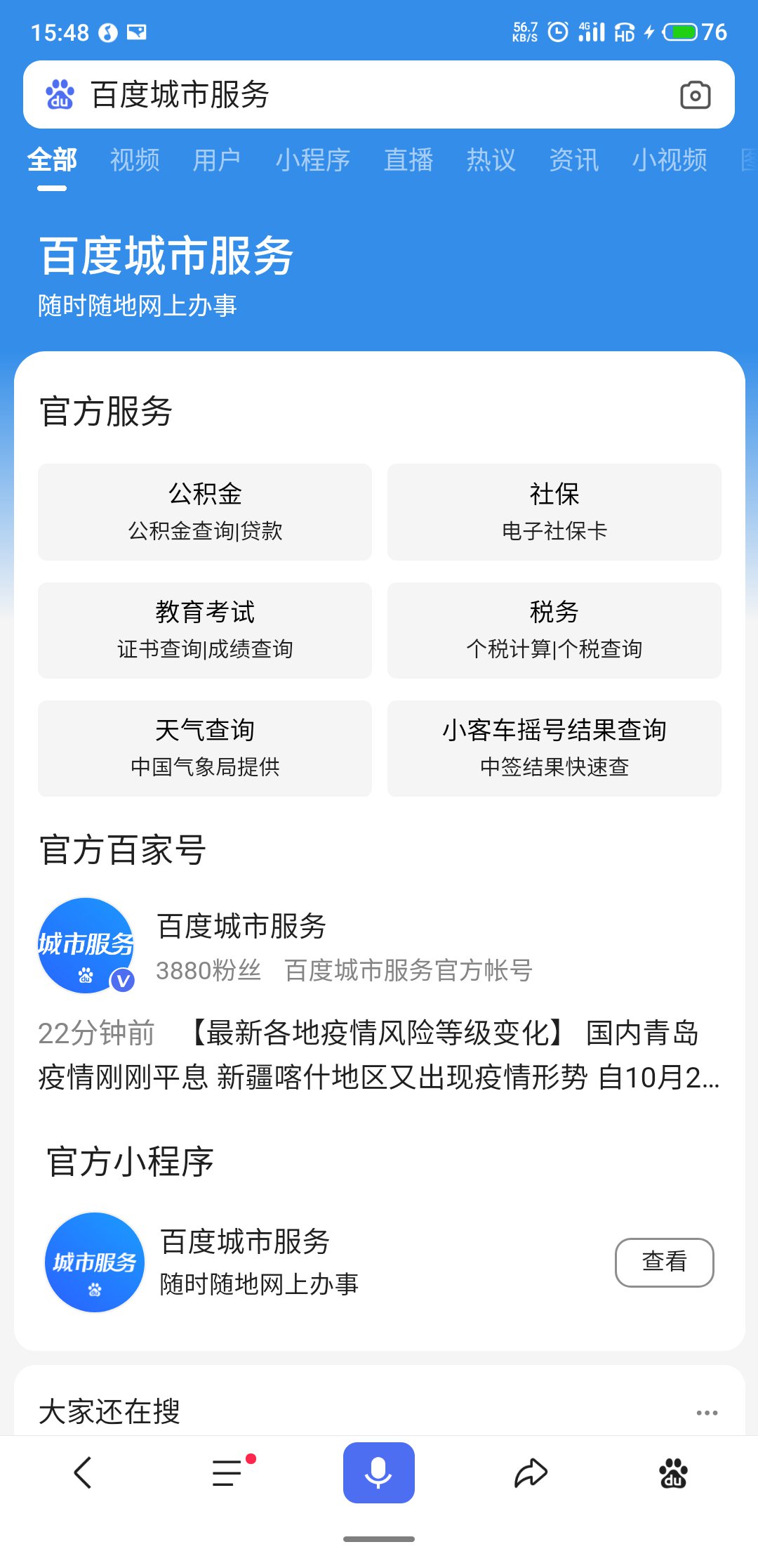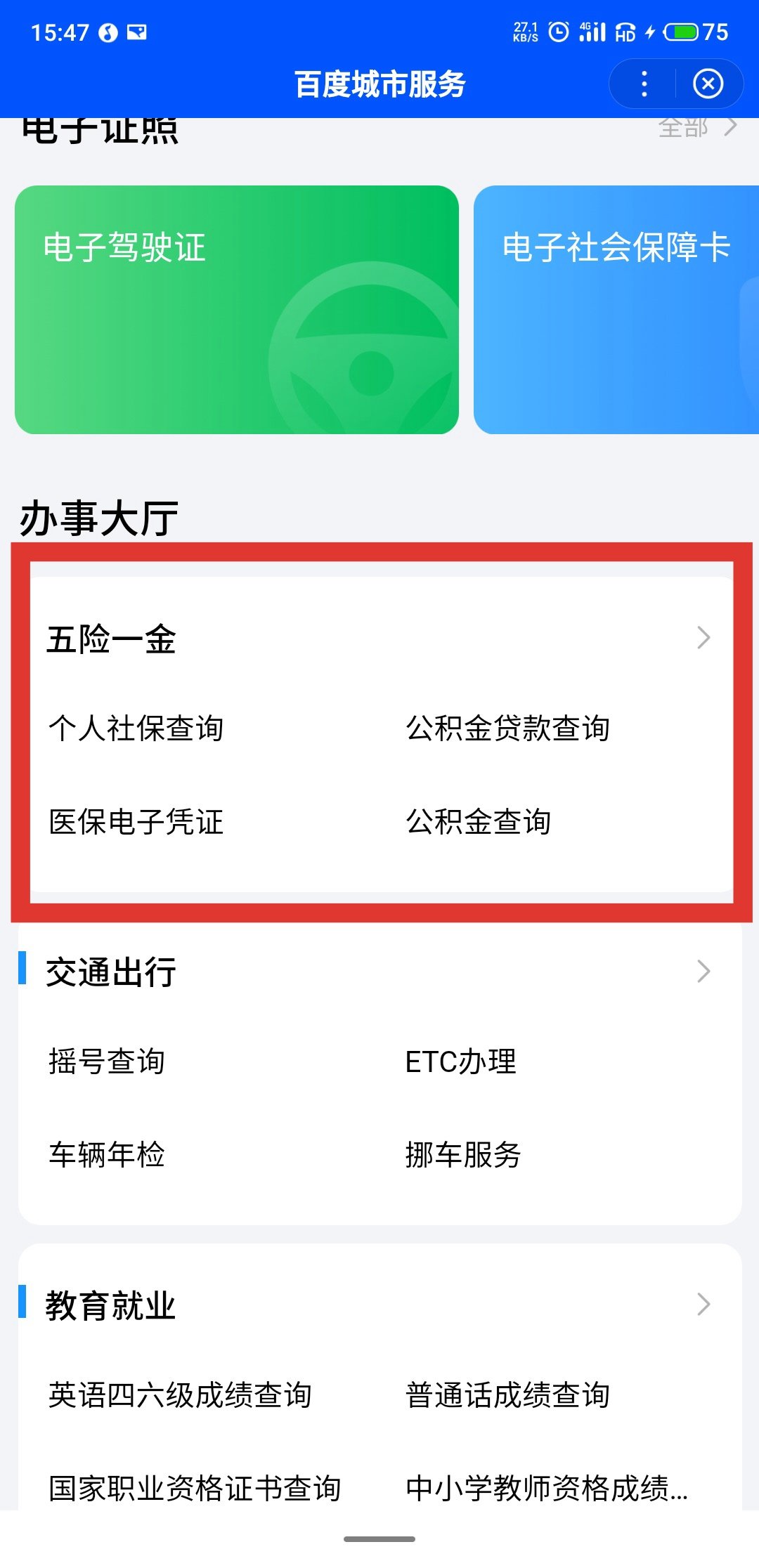 第一步:进入百度城市服务小程序,点击“五险一金”,点击“失业金申领”
