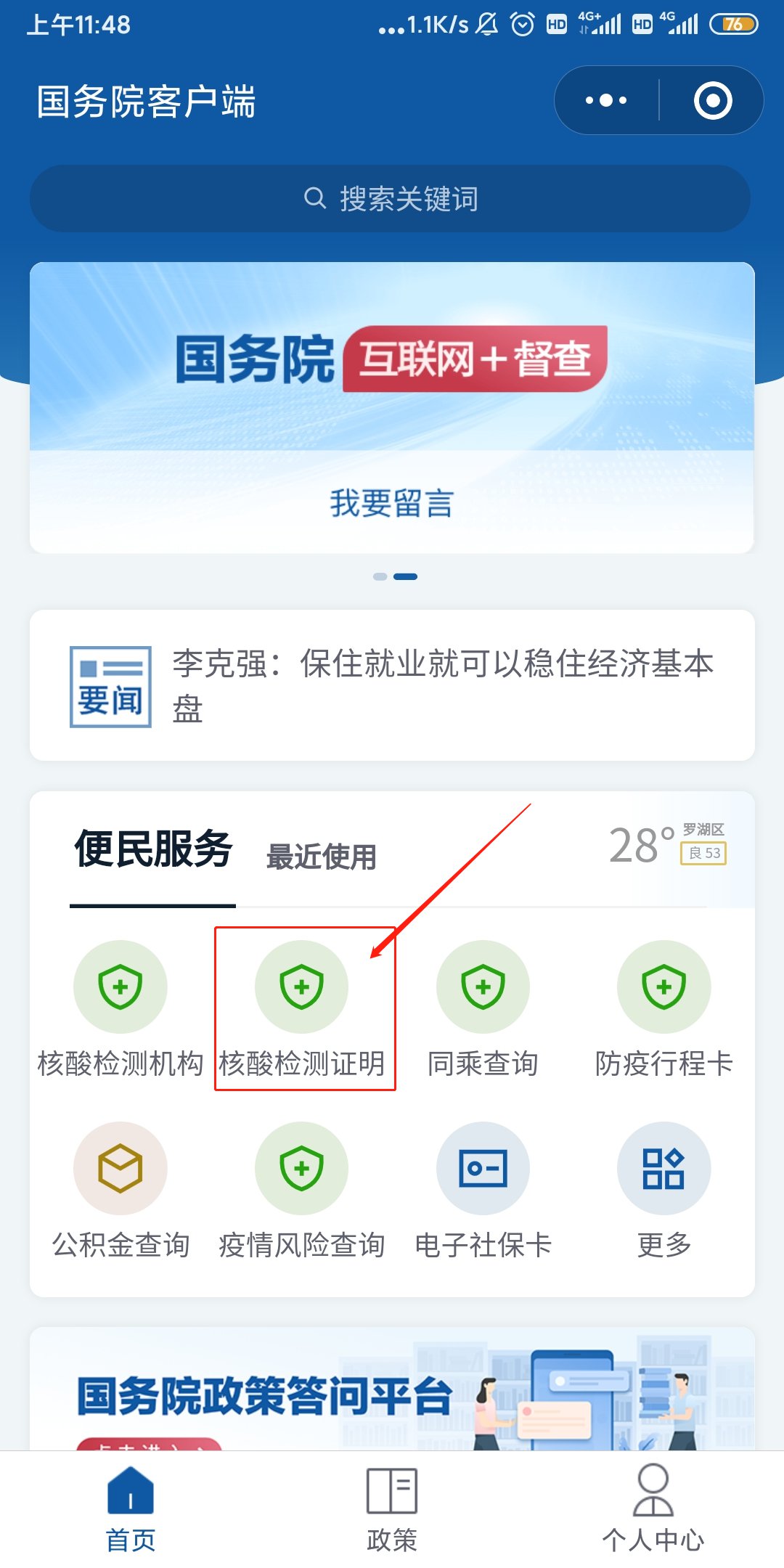 在“国务院客户端”小程序首页点击“核酸检测证明”,进入查询页面,完成身份验证后,输入个人信息,即可获取核酸检测结果。: