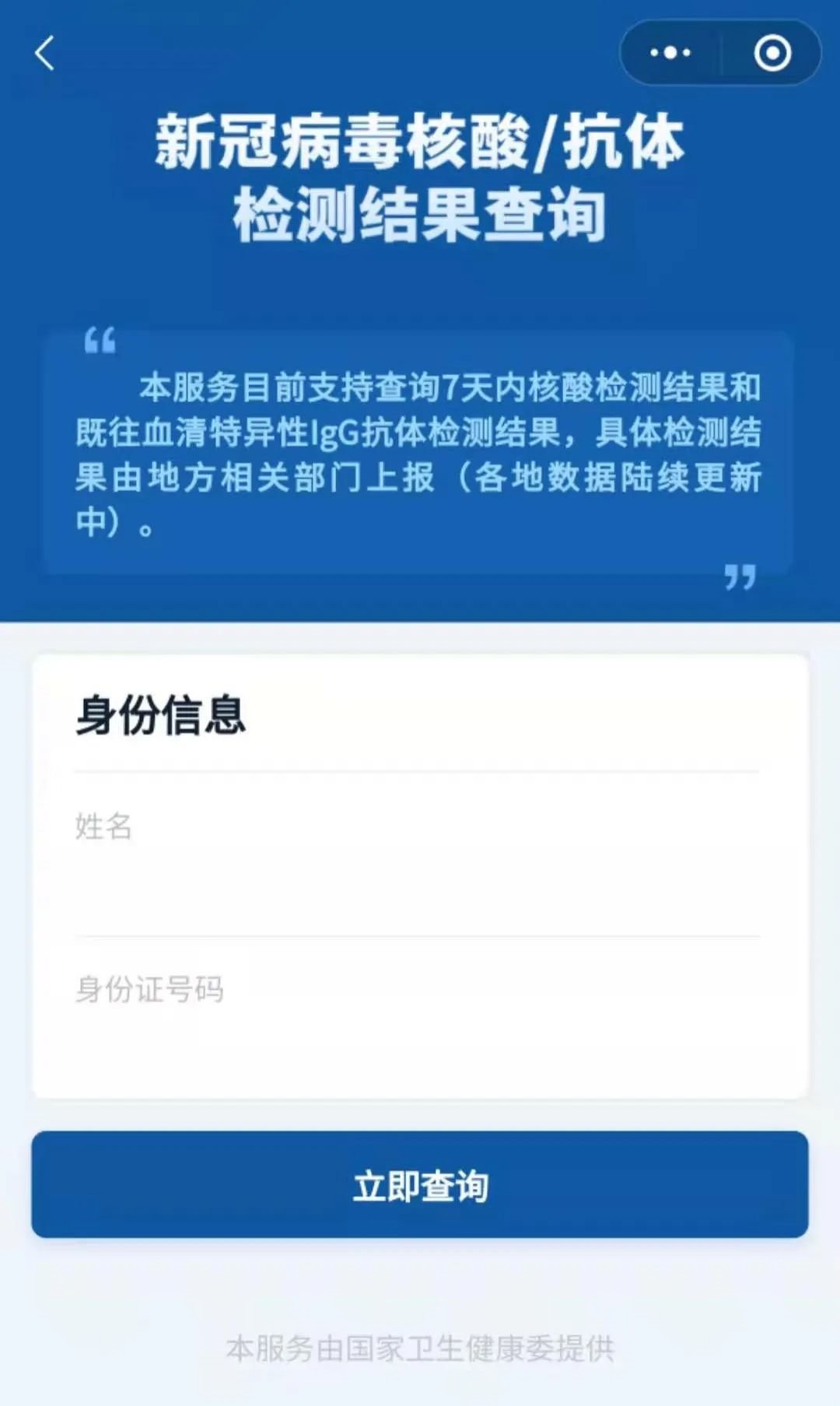 查询入口:点击进入(核酸检测后次日可查),进入首页后,输入个人信息即可查询自己的核酸检测报告。