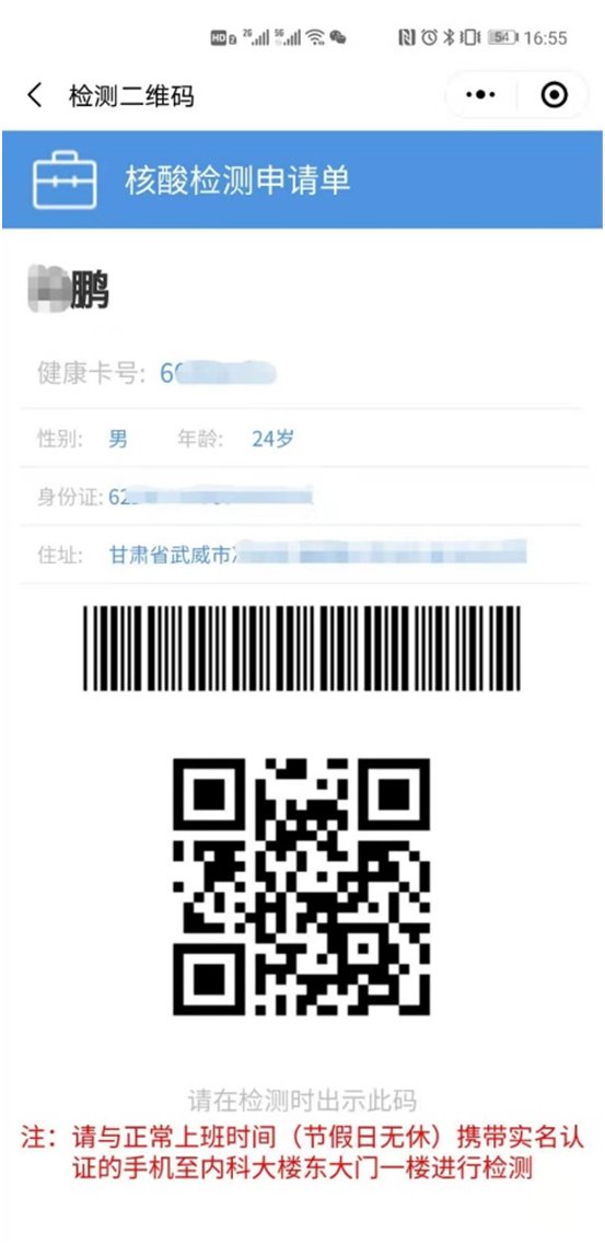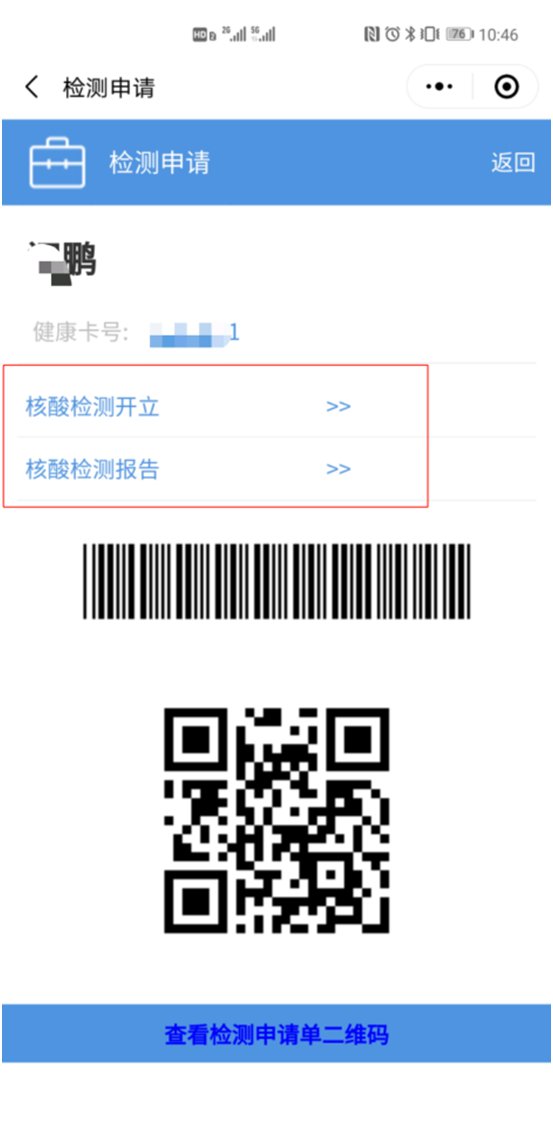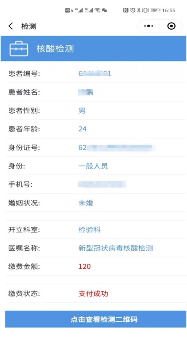 第五步:缴费完成后生成的核酸检测申请单二维码,可截图保存。【二维码也可点击“查看检测申请单二维码”获取】