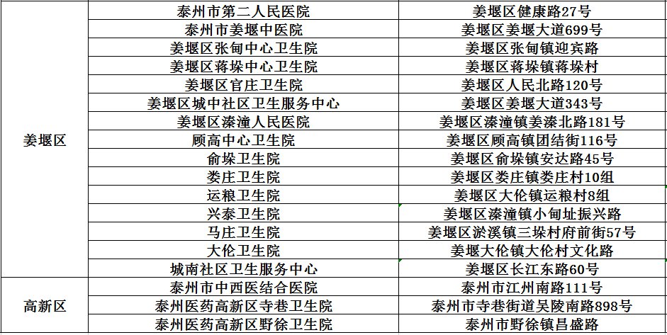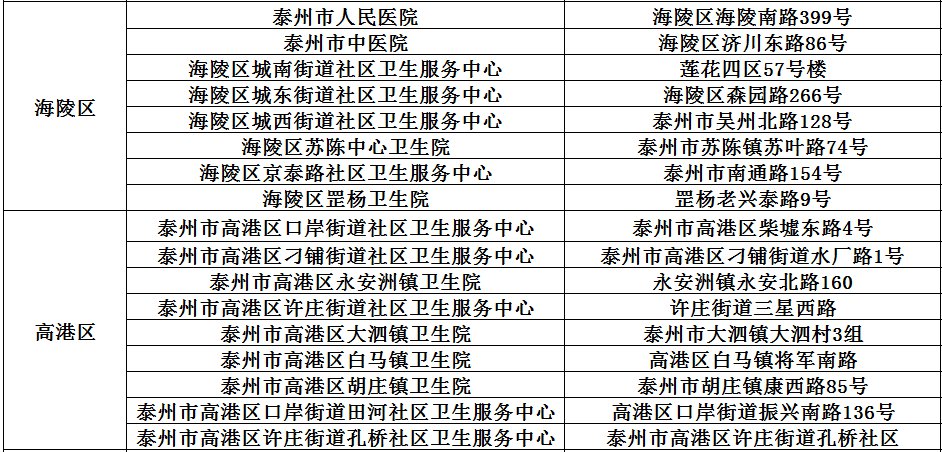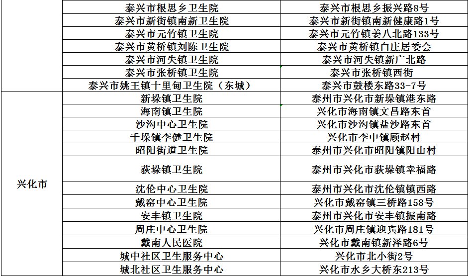 目前泰州市已指定接种单位共86家,其中,靖江市7家、泰兴市31家、兴化市13家、海陵区8家、高港区9家、姜堰区15家、高新区3家,具体如下: