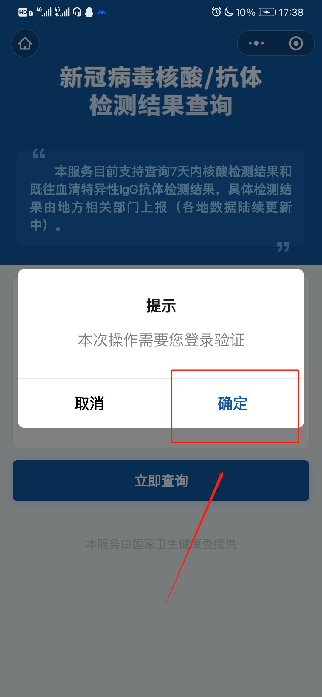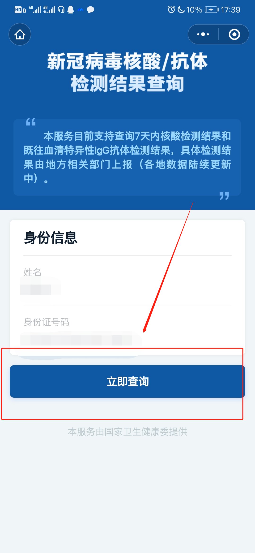 第三步:实名人脸验证成功后,点击“立即查询”即可查询个人新冠病毒核酸/抗体检测结果。