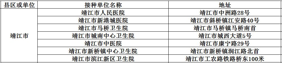 其中,靖江市7家、泰兴市31家、兴化市13家、海陵区8家、高港区9家、姜堰区15家、高新区3家(指定接种单位实际开诊数会根据疫苗供应情况动态变化),具体如下: