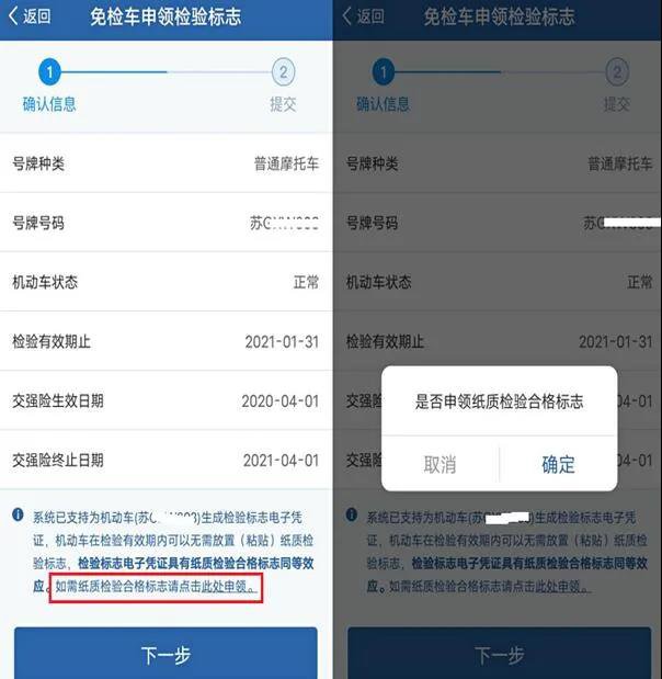 3、信息确认页面,核查当前办理业务机动车信息是否正确完整,此处可以选择邮寄纸质合格标志