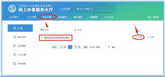 1.线上:登陆江苏省人社网上办事大厅,进入“单位办事”页面,搜索“稳岗返还补贴信息单位确认”模块,点击“申报”进入页面,维护银行账户信息。
