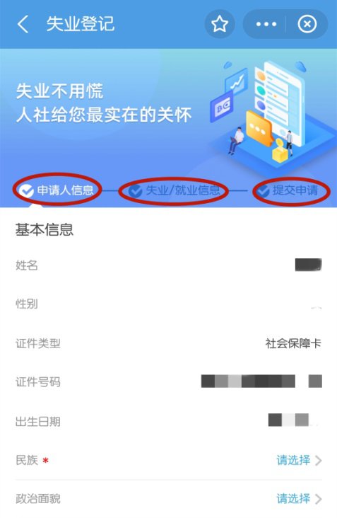 第三步:点击“失业登记”,依次填写“申请人信息”——“就业/失业信息”,点击“提交申请”。