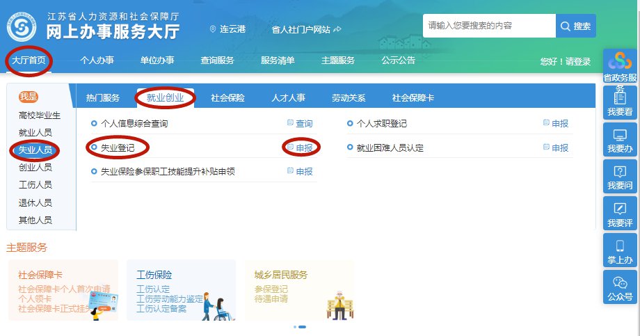 1.登录江苏省人社网上办事大厅,进入“大厅首页”,点击左侧“失业人员”一栏,再点击“就业创业”,选择“失业登记”一栏,进行申报。