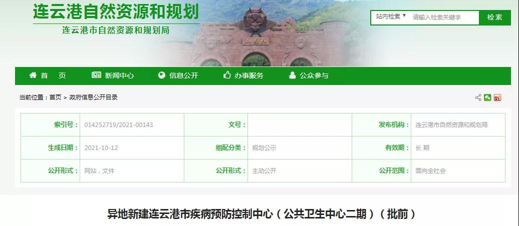 2021年10月12日,连云港市自然资源和规划局网站公示了异地新建连云港市疾病预防控制中心(公共卫生中心二期)(批前)。