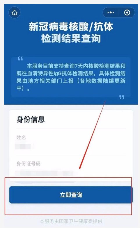第三步:正确输入姓名和身份证后,点击“立即查询”即可查询个人新冠病毒核酸/抗体检测结果。(如下图所示)