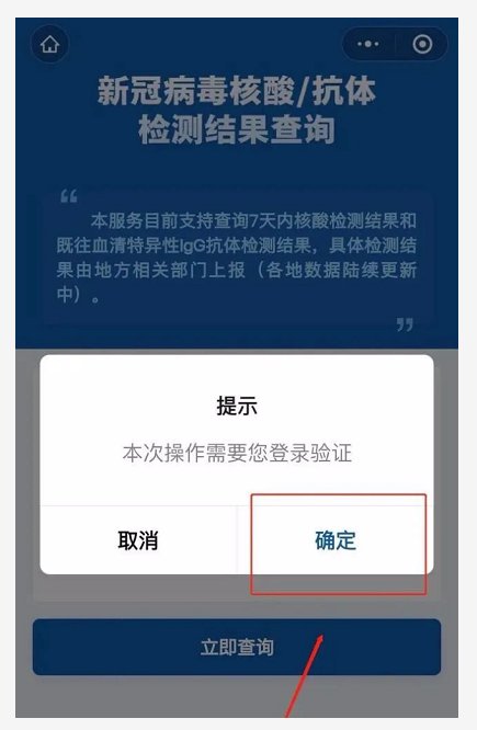 第二步:在首页页面中找到并点击“核酸检测证明”,首次查询需要进行登录验证,点击“确定”进入验证。(如下图所示)