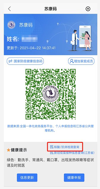 (2)查看“苏康码”页面,在页面右下方点击“核酸/抗体检测查询”就可以查询到本人的信息和核酸检测时间以及结果。