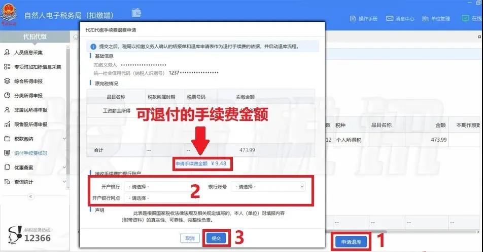 2.若发现扣缴客户端的结报单数据有误的,也可到税务大厅核对并确认结报单;在年度内扣缴义务终止的,应在终止后3个月内向税务机关提交手续费申请资料,由税务机关办理手续费清算。