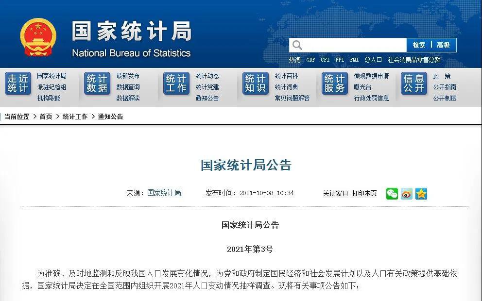 国家统计局发布公告:10月10日至11月15日,在全国范围内组织开展2021年人口变动情况抽样调查。如您家被抽中,作为调查对象的住户,将有调查员入户登记或由住户自主填报。